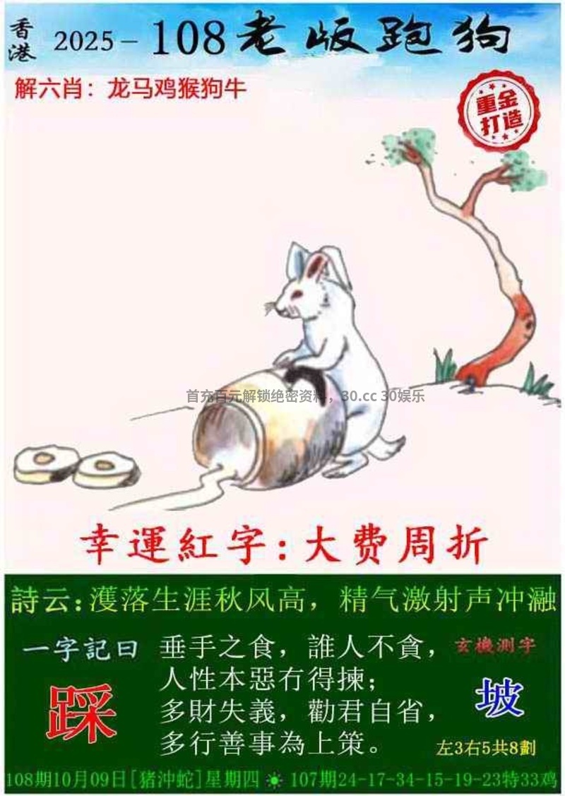 108期:今期牛狗蛇看定,特碼旺大和单出开猪07准 ①杀肖:鼠龙虎 ③大数+单数 |